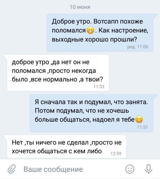 Познакомился в ВК с одной бабой. На внешку 4/10 (толстовата, колхозное лицо) ну ладно, мы ж планочку то опустили, сами то не модели как никак ☺ . Начали общаться, там общие интересы нашлись. Потом я её пару раз за 2 недели пытался перетащить в реал. Но в первый раз она приболела, а во второй раз была всю неделю занята. Ну ладно "поверим". Перешли в востапп. И через несколько дней она сама предлагает встретиться, дословно "а когда мы встретимся?". Там как раз выходные были и я уезжал за город потусить с друзьями (уже договорились и ради неизвестной бабо отменять гарантированную классную тусу я естессно не стал). Ну и сказал ей, что на выходных не могу, зато после в любой день, даже в общем то с работы мог бы пораньше отпроситься. Ну ОК. Потом пишу ей в вотсапп с понедельника - нет ответ... показать полностью...